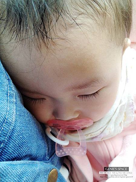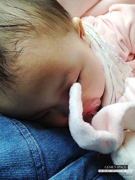 果然過十分鐘開始哀..媽咪我立刻推倒她..給他奶嘴跟被子..抱著被子睡著了